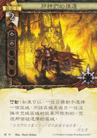 :如果可以,一位目标对手选择一个区域,而该区域是由另一位没拥有焚城区域的玩家所控制的。焚毁那个被选择的区域。