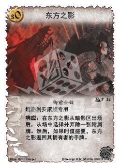 :在东方之影从暗影区出场后,从场中选择并弃除一张附属牌。然后,如果时值盛夏,东方之影返回其拥有者的手牌。