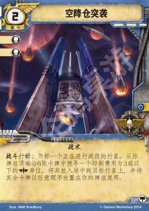 文本战斗行动:目标一个正在进行战役的行星。从你牌组顶端的6张卡牌中搜寻一个印刷费用为3或以下的星际战士单位。将其放入场中到目标行星上,并将其余卡牌以任意顺序放置在你的牌组底部。
