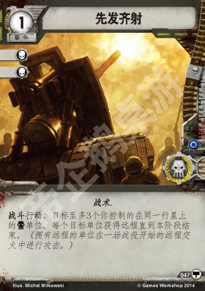 文本战斗行动:目标至多3个你控制的在同一行星上的帝国防卫军单位。每个目标单位获得远程直到本阶段结束。(拥有远程的单位在一场战役开始的远程交火中进行攻击。)